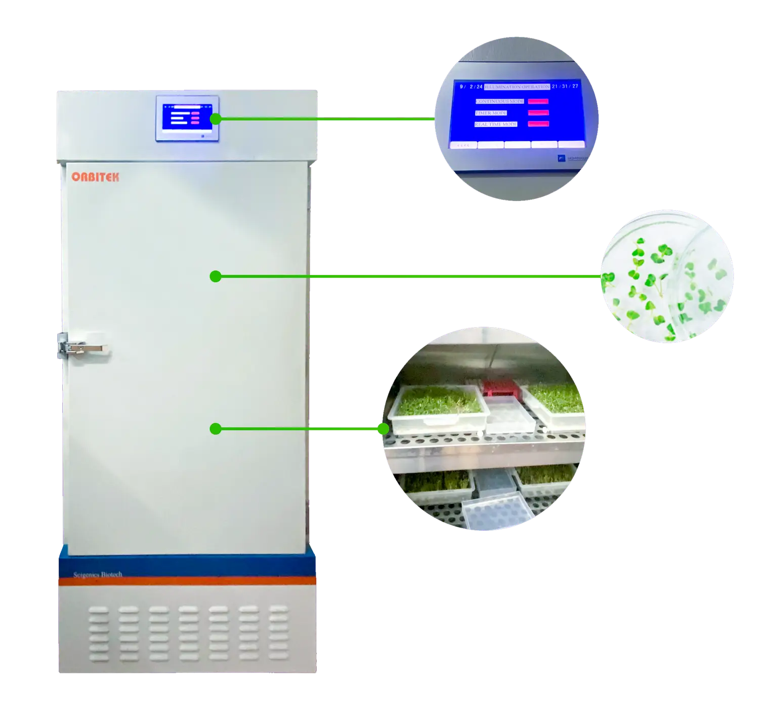 Introducing ORBITEK", state-of-the-art Growth Chamber, meticulously crafted to establish optimal conditions for plant cultivation and cutting-edge research. The Growth Chamber is a sophisticated closed cabinet featuring control over crucial environmental variables, including temperature, humidity and light intensity. This capability provides researchers with a controlled platform to conduct experiments and studies with precision and reproducibility.